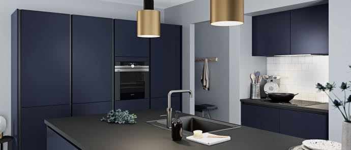 10 mm hvít CoreStone borðplata skapar fallega andstæðu við Harmony Dark VH-7 eldhúsið.
